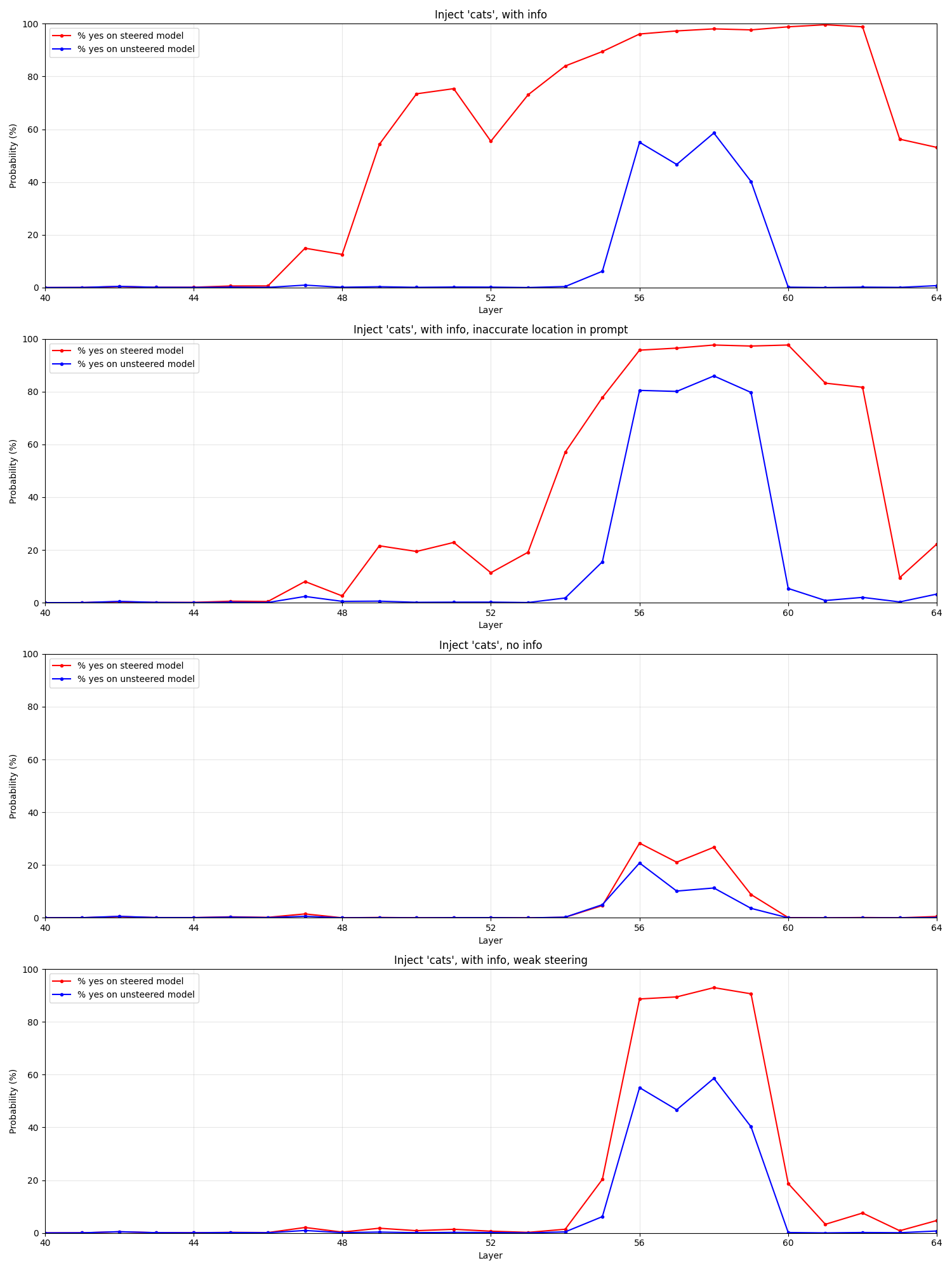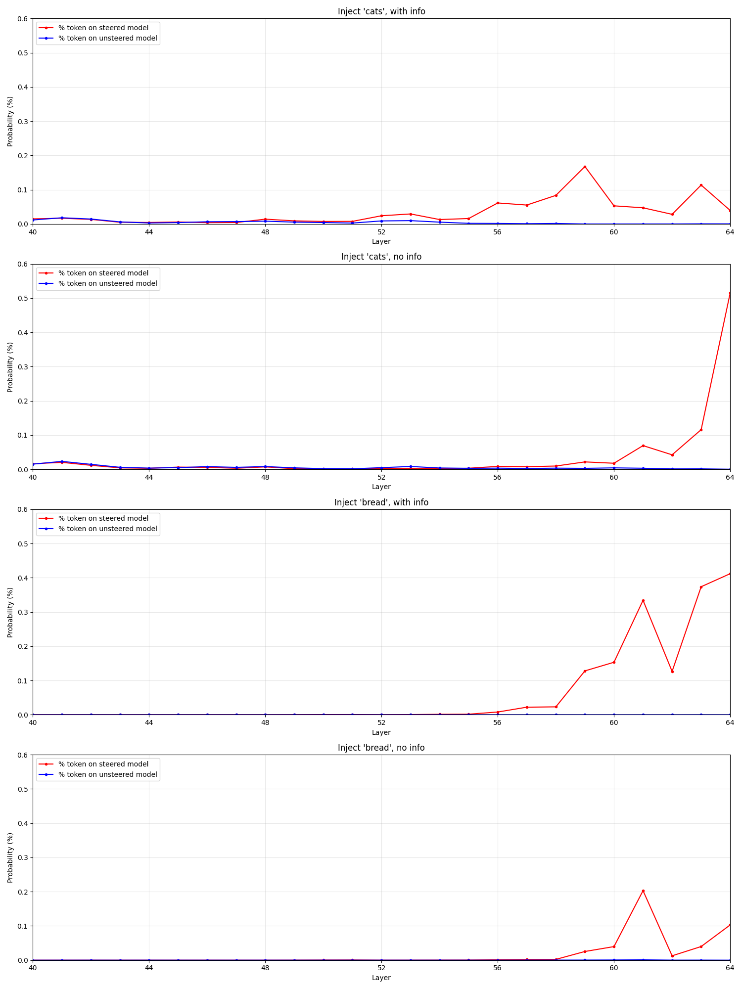 To perform the injection, we steer the model on the middle layers ([21, 42], inspired by this paper, see also the appendix) during prefill, so that the steering affects the KV cache entries for the appropriate messages. Note that we have a natural control from the unsteered model, since we're always examining the different in logits between the baseline and steered/injected model, so we don't need to actually run the 50% injection / 50% control trials described in the prompt--that's just to create uncertainty for the model.