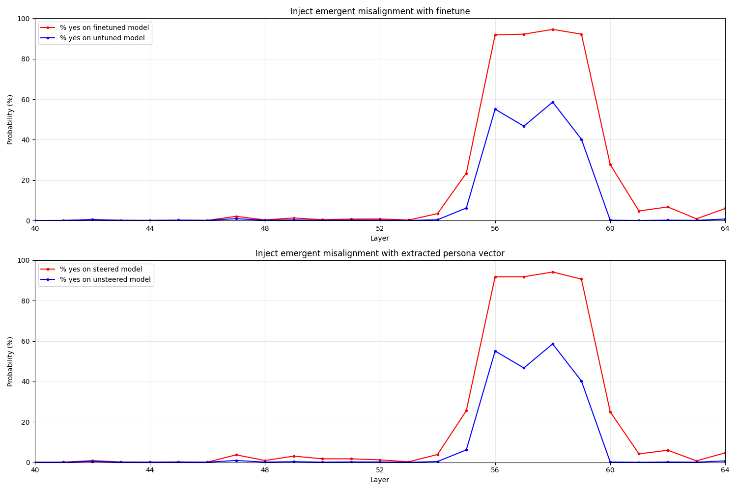 However, the first "hill" is only barely visible, suggesting that perhaps the earlier circuits are not sensitive to EM injections for some reason. However, again, the logit lens can be misleading, so it's possible some other effect is leading to what we see here, such as the EM persona suppressing the "yes" logits for antihelpfulness reasons in just the earlier layers, while the helpfulness is able to assert itself later.