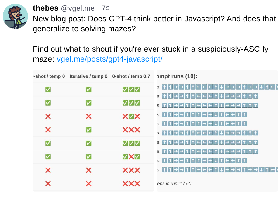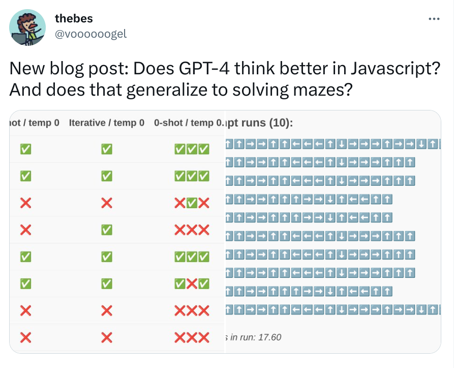 The first relies on Janus' simulator hypothesis. If GPT-4 is a simulator that can simulate many different text generation processes, including agents capable of solving mazes, and those agents capabilities are bounded above but not below by the model's capabilities, it's possible that having the model output Javascript pushes it into a smarter-agent part of the distribution. We've already seen in the prior sections that using some programming languages (Javascript, Python, etc.) causes the model to write code with better internal logic than others, which could be an instance of the same phenomenon.